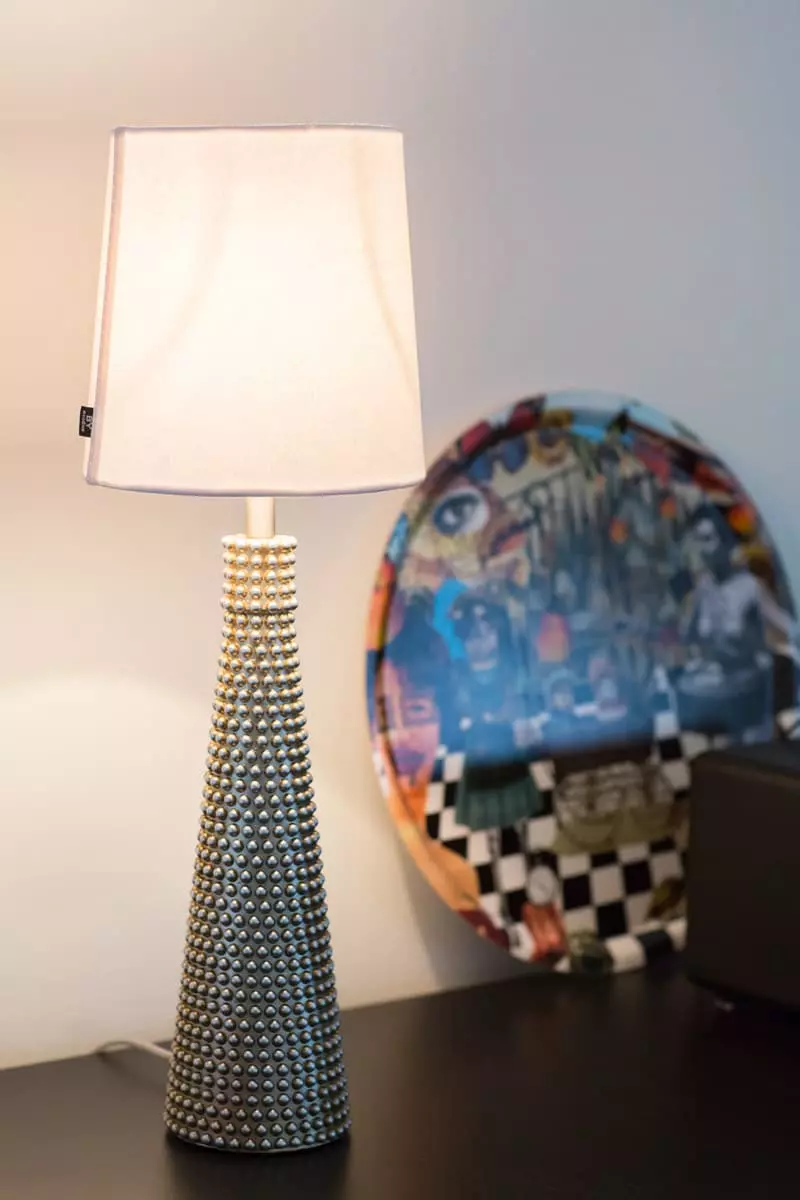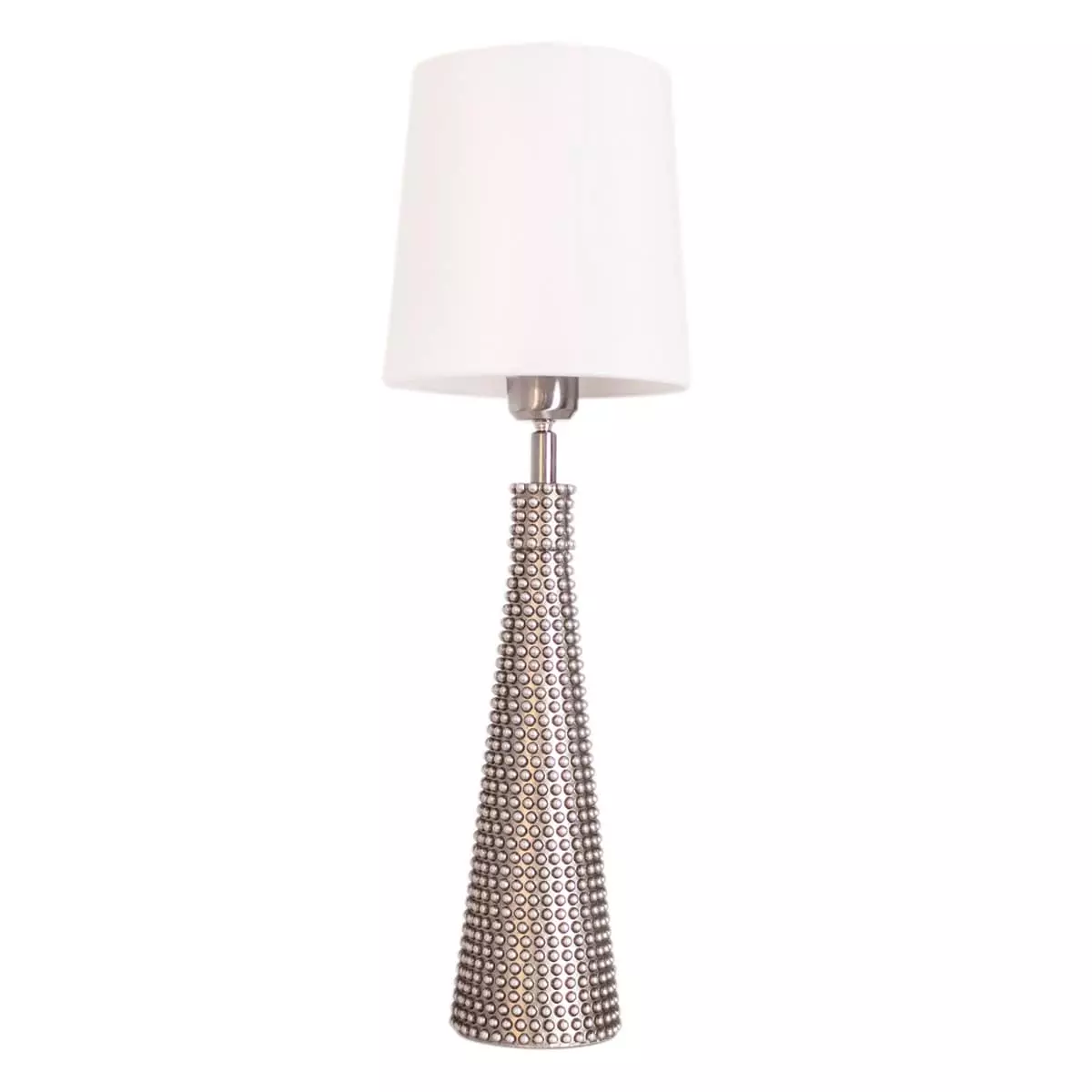 Lofty Slim table lamp from By Rydén in stylish silver coloured metal with a cotton-covered lamp shade. The exclusively shaped lamp base gives a slightly oriental vibe. Fits well in your window as well as on a side table.
