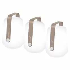 Drie Balad-lampen van Fermob is een charmante buitenlamp – zet hem op tafel of hang hem aan het plafond of in een boom. De lamp wordt opgeladen met de meegeleverde USB-kabel.