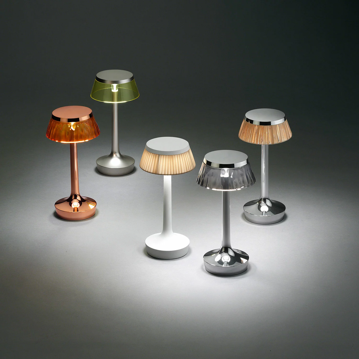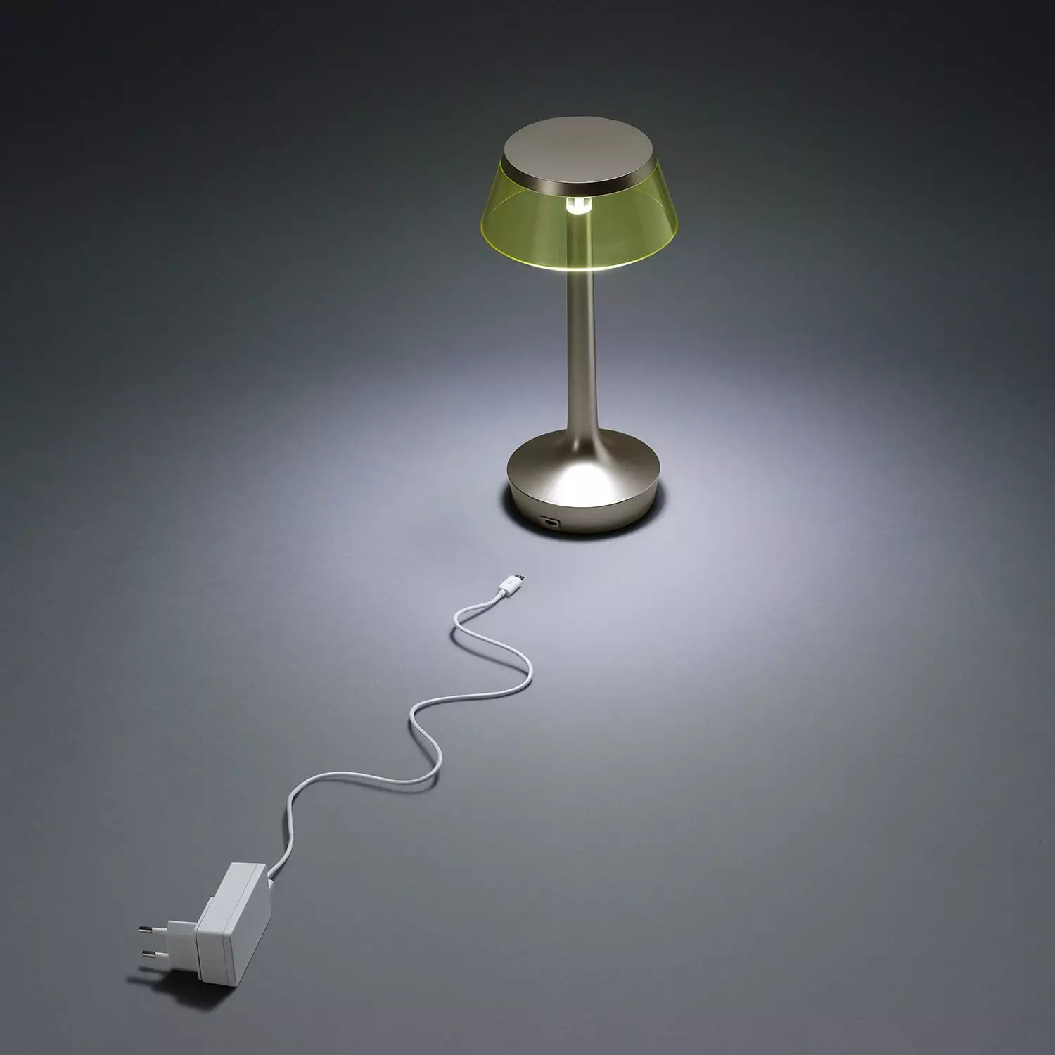 Bon Jour Unplugged lamp base from Flos, designed by Philippe Starck. Unplugged is a smaller version of the regular Bon Jour lamp but with a massive difference, it is cordless making it portable. Unplugged table lamp has a rechargeable micro-USB battery that lasts up to 6 hours. Unplugged can be complemented with a wide selection of various lampshades in different colours. 4 step dimmer function. Lampshade is not included.