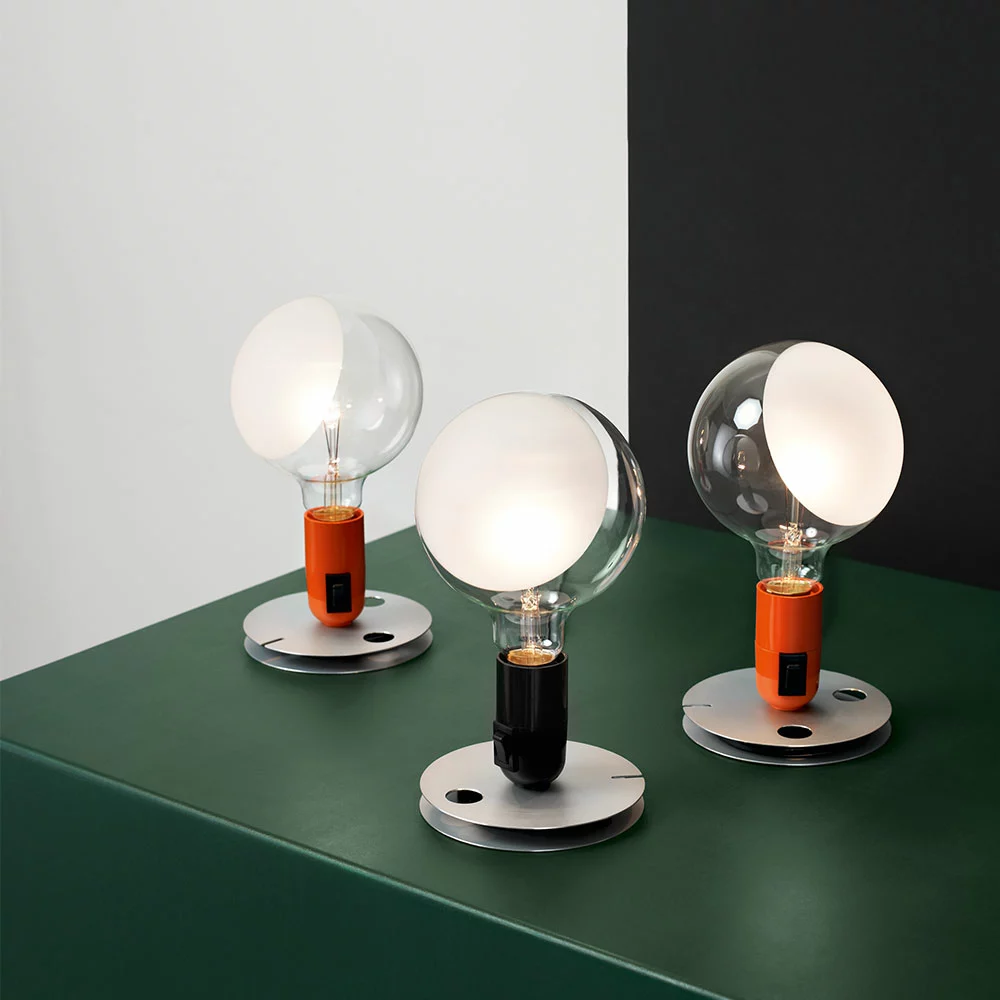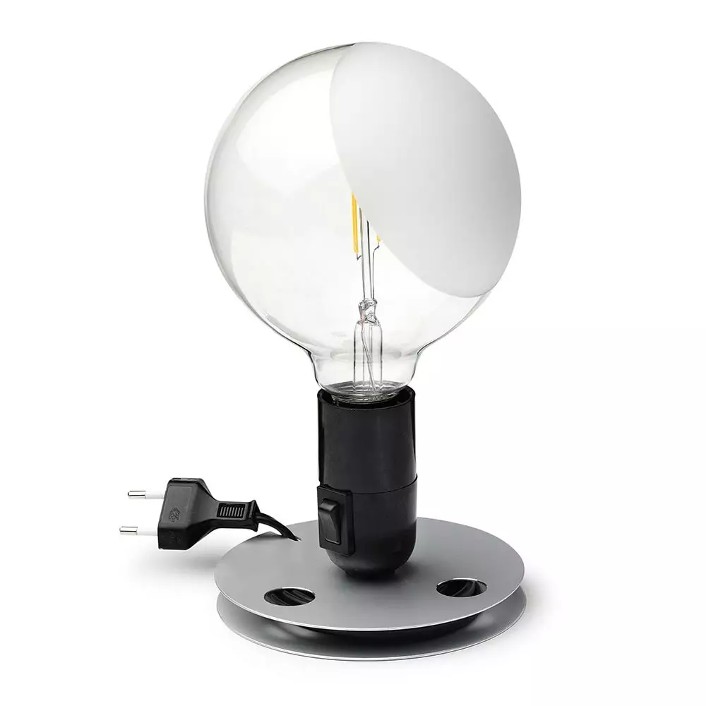 Lampadina table lamp was designed in 1972 by Achille Castiglioni and is made by Flos in Italy. This lamp is a contemporary icon. It illuminates any room very beautifully. The product has an interesting bulb shape that makes it very entertaining and elegant. Anodized aluminum, black.