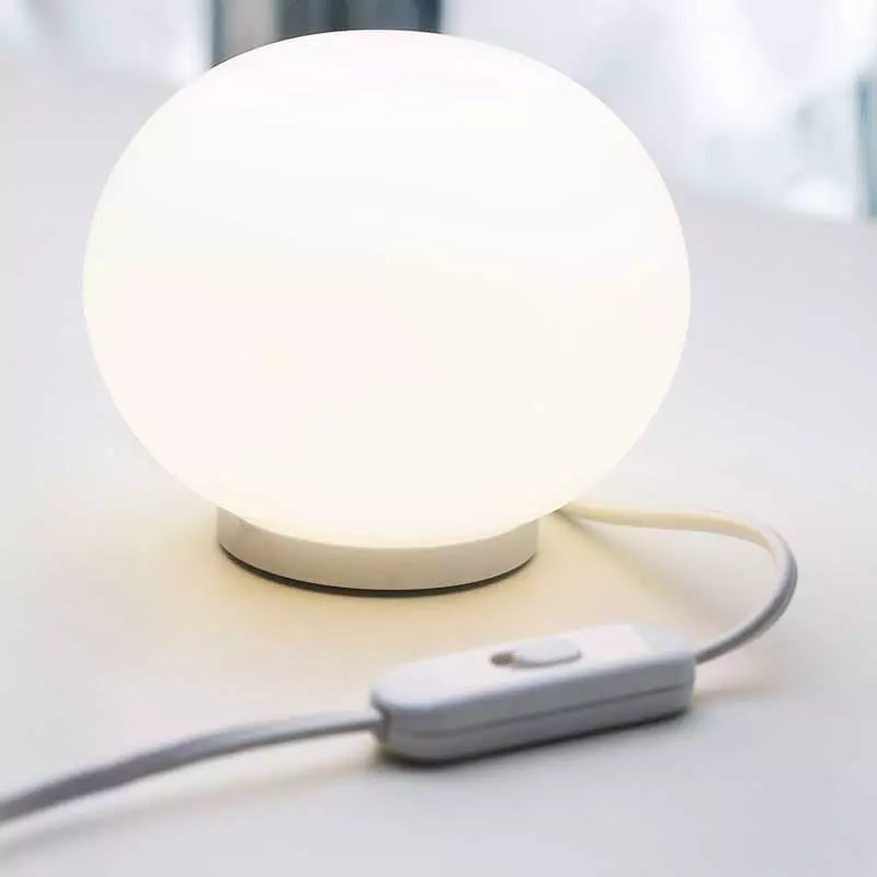 Mini Glo-Ball T table lamp from Italian Flos, designed by Jasper Morrison. A series of stylish lamps in hand blown glass. Glo-Ball may not look much for the world but becomes a decorative and beautiful light source in your home. The lamp gives a cozy and stylish shine. Fits nicely in the shelf, bench or on the TV bench and fits perfect with other models in the Glo-Ball collection.