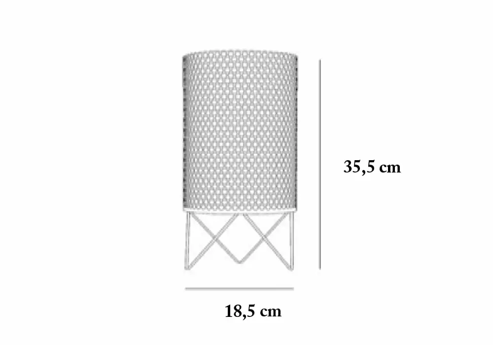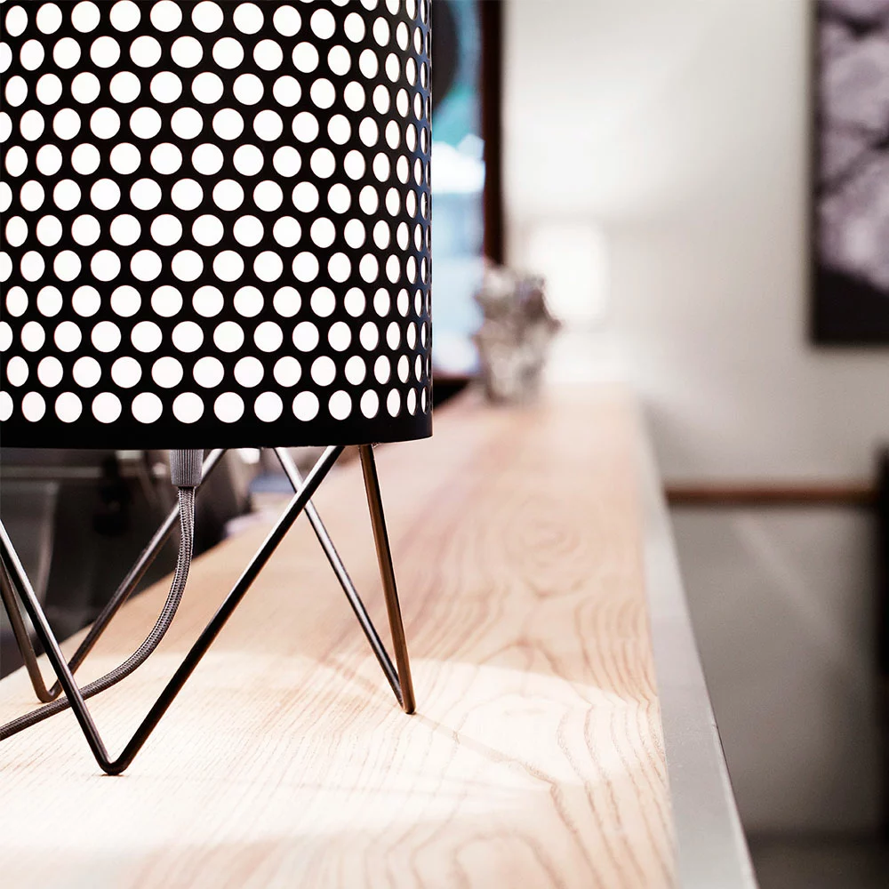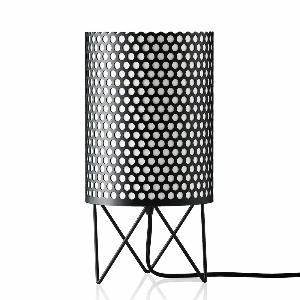 PD4 ABC table lamp from GUBI, designed by Barba Corsini & Joaquim Ruiz Millet. PD4 Lamp from the Pedrera series is both classical and modern, inspired by the La Pedreras chimneys in Barcelona. The lamp consists of painted perforated metal which is later powder coated. Inside the screen is a polyethylene housing that allows the light to be emitted in a comfortable and warm light. With its simple design and weight, it is easily placed on the bedside table or just about anywhere in your home.