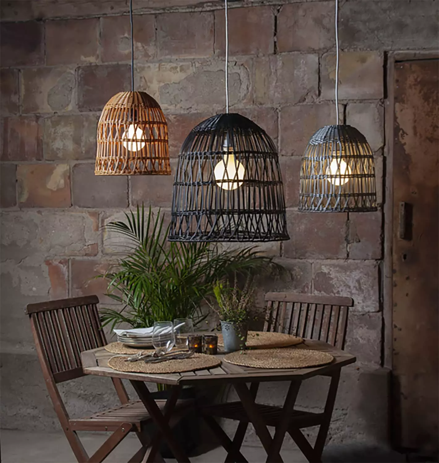 Modern lampshade in art rattan for outdoor use. With braided structure, it gives an exciting light play and creates a lovely atmosphere. Ideally used with E27 socket.